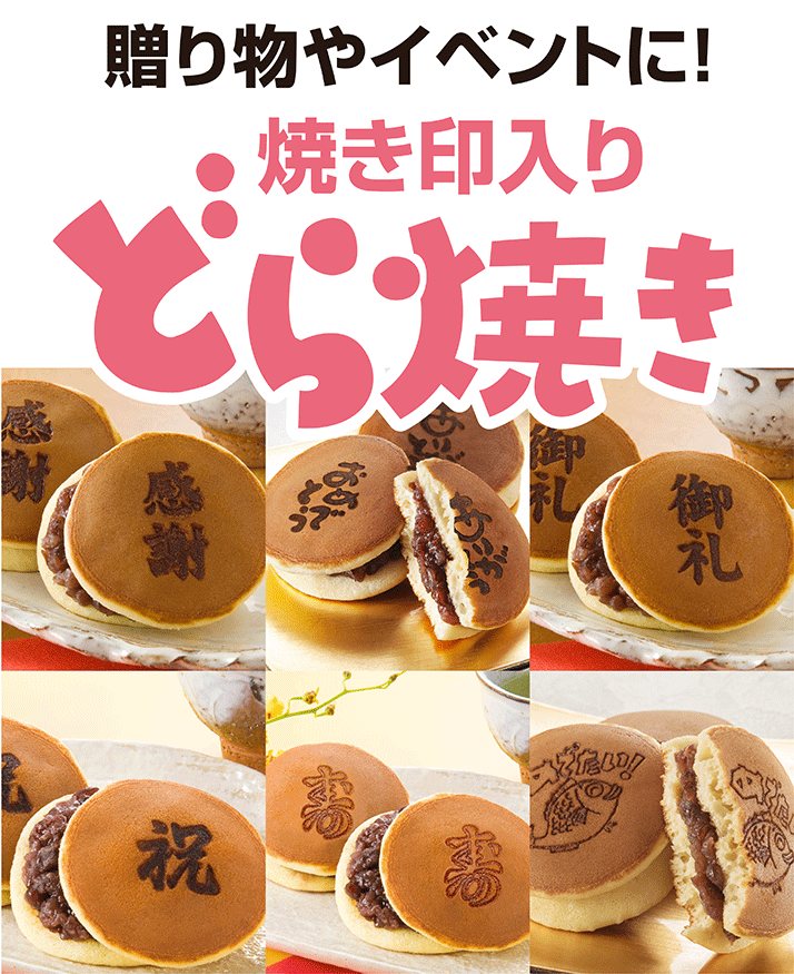 入り「ありがとう」の焼印ロゴ入り どら焼き(三笠)。新鮮な広島県産地鶏卵とアカシア蜂蜜を使いしっとりしたかすてら生地に、北海道産小豆を使用した自家製粒あんをやわらかく炊きあげたどら焼きです。