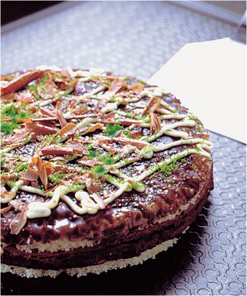 「たこ焼き」に次ぐ、関⻄名物「⼤阪⾵お好み焼き」に⾒⽴てたチョコレートムースケーキです。